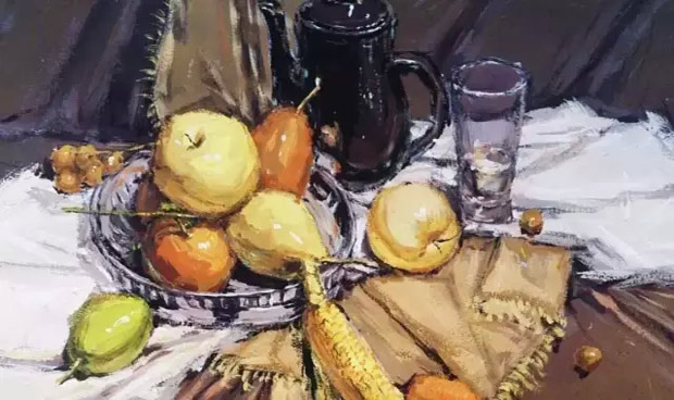 在我們畫畫時,物體的種類眾多,質感各異,而物體的質感又可以通過用筆、用水、筆觸等多種方式來表現,如光滑的物體可以用圓潤的筆觸加以高光表現、粗糙的物體可以用筆觸表現其肌理。無論何種表現形式,都應該要服從整體,對于畫面里的中心物體要重點刻畫,讓畫面看起來有看頭,而這些物體的質感表現也要處理的比周圍的物體更細膩到位,如刻畫襯布的褶紋、玻璃器皿的體面轉折、反光,毛巾的疏松柔軟等細節。