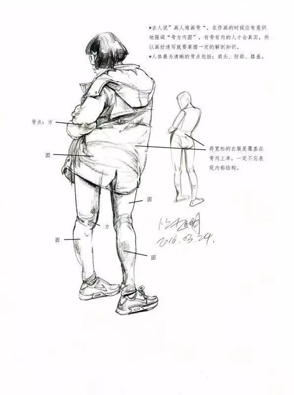 貼肉的形體部分是不能有太多的,畢竟對表現形體沒太大作用。想要保證形體的張力、要有弧度,這些地方就沒太大必要去表現衣紋,例如后背、大腿前側和小腿肚這些,都是不需要加衣褶。