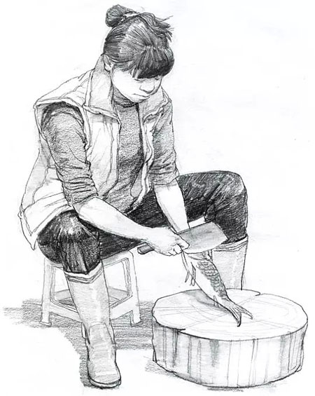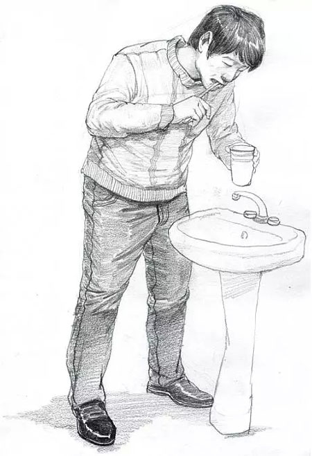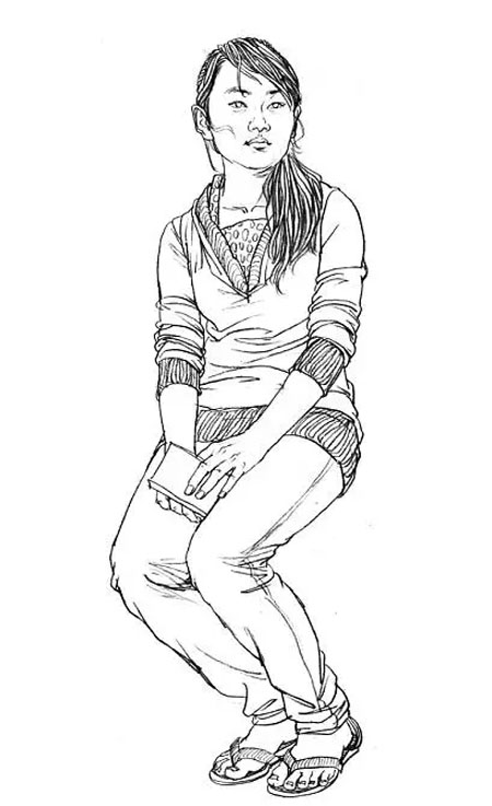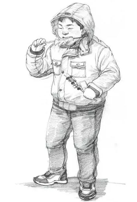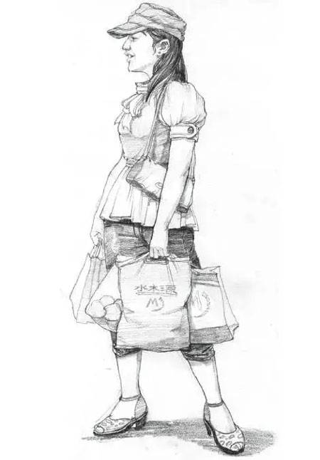 裝飾線對于動作速寫不是十分重要,多指衣服上的布兜、扣子、衣襟縫紉,服飾圖案或一些其它裝飾品。這些裝飾品的添加有利于表現畫面的疏密效果和增強畫面的審美情趣。裝飾線的用線要弱。