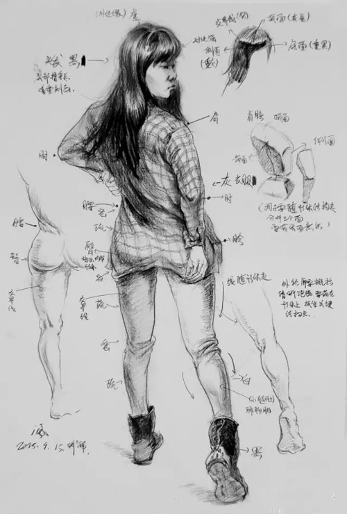 坐五(我們知道,在產(chǎn)生坐姿比例時(shí),上半身基本保持不變,而產(chǎn)生比例變化的地方就在骨盆和髕骨之間)、盤三半(根據(jù)人物的動(dòng)態(tài)變化觀察比例)。這是畫好速寫的第二步,這一步強(qiáng)調(diào)在平時(shí)訓(xùn)練學(xué)習(xí)過(guò)程中,我們必須熟練掌握并了解人體的基本比例。
