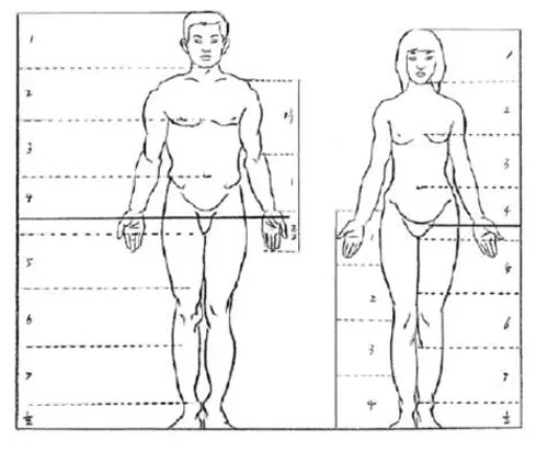 即以頭為基本單位,按從發(fā)際線——下頜——胸線——肚臍之間的距離定為3個(gè)頭長(zhǎng),還有臍孔到恥骨聯(lián)合為一個(gè)頭長(zhǎng)。腳底——髕骨——恥骨聯(lián)合線為4個(gè)頭長(zhǎng),骨盆線到肚臍還有半個(gè)頭長(zhǎng)。