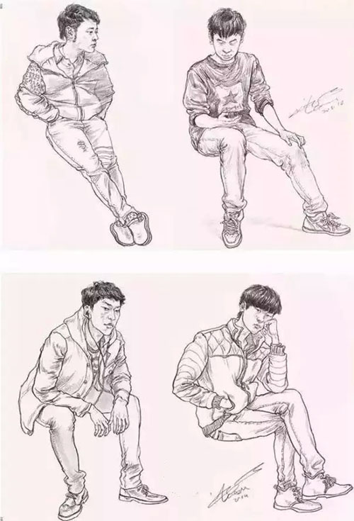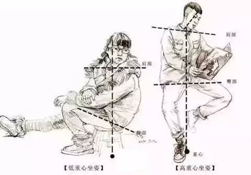 坐姿在整個(gè)比例,會因坐平面的高度而產(chǎn)生變化。做的越低則整體比例越短,反之越長。當(dāng)人物盤腿在地時(shí),整個(gè)高度約等于3.5個(gè)頭,坐在正常高度時(shí),約等于5.5個(gè)頭,坐在比較高處約等于6.5個(gè)頭長。