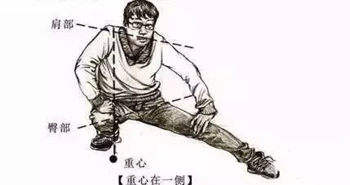 人體直立時(shí),人物肩、臀、腿呈平行狀態(tài),此時(shí)中心在雙腿之間。