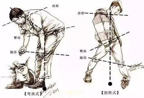 人物整體比例變短,胸腔、盆腔在前側(cè)形成夾角,背部彎曲,輪廓明顯。