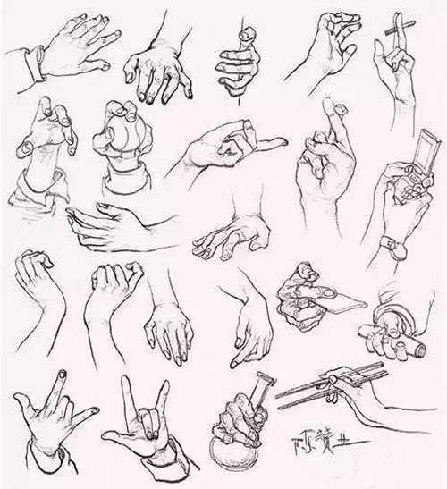 畫手要把握好胳膊、手腕及手三者間的轉(zhuǎn)折、屈伸的節(jié)奏關(guān)系,勾畫出手部的特有感覺。可以頭部作參照畫出手臂,通過與頭部的比較,來確定手的位置、大小,但要要注意手與頭部的呼應(yīng)。在氣勢上也要貫通,對線的勾勒應(yīng)放松一些,要強(qiáng)化線條的意趣。線條要有粗有細(xì),穿插進(jìn)進(jìn)退,主次分明。