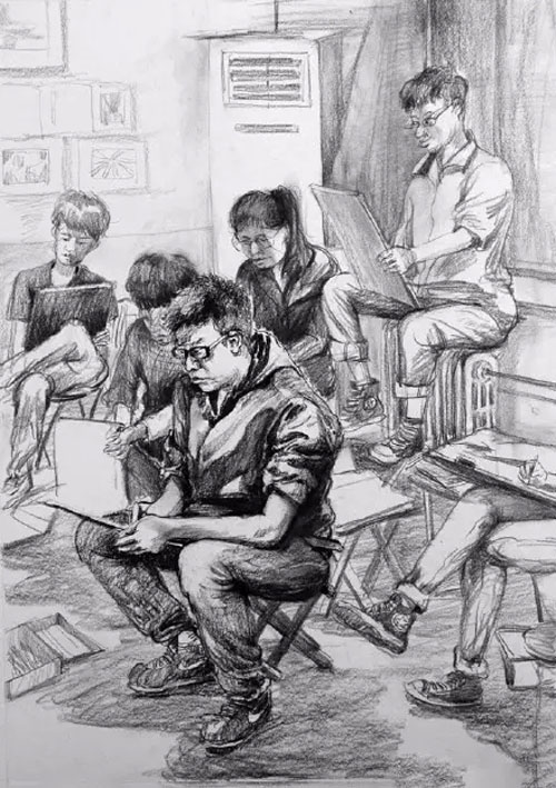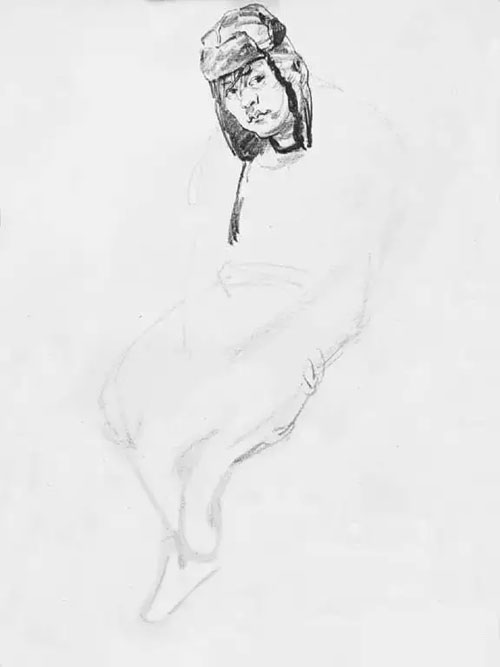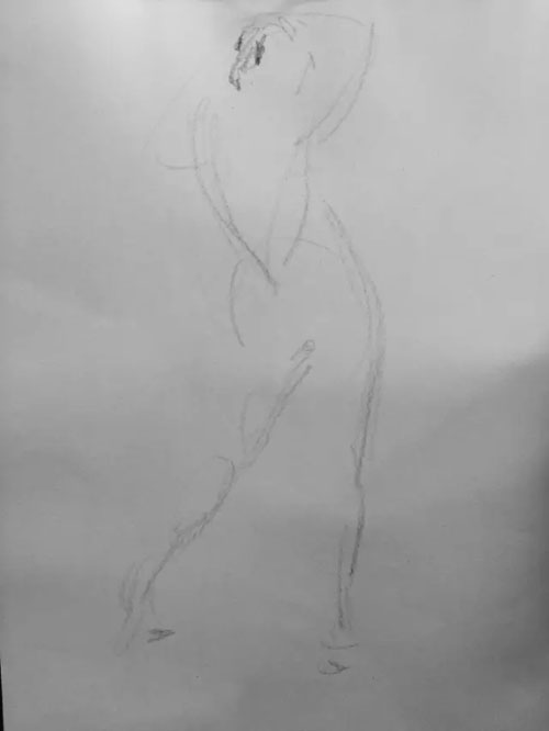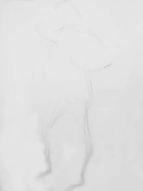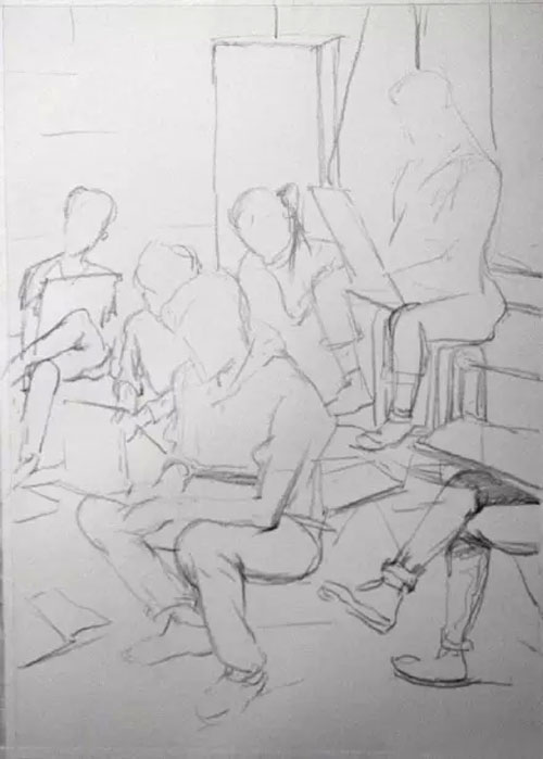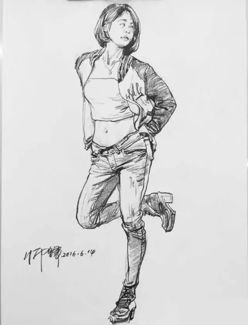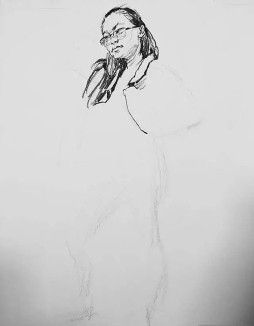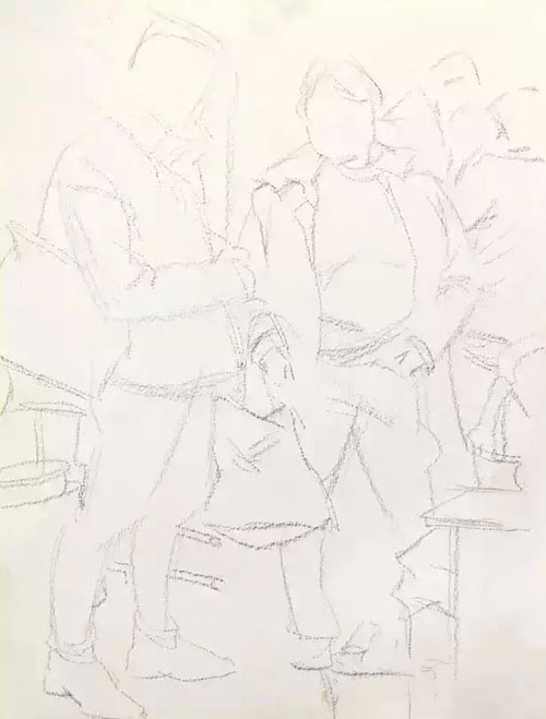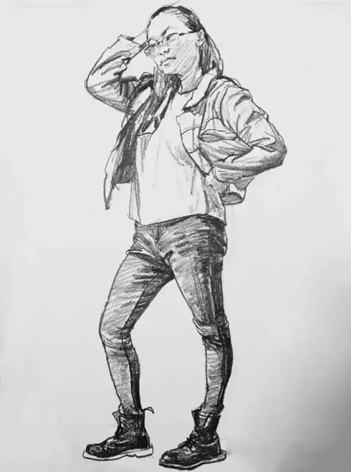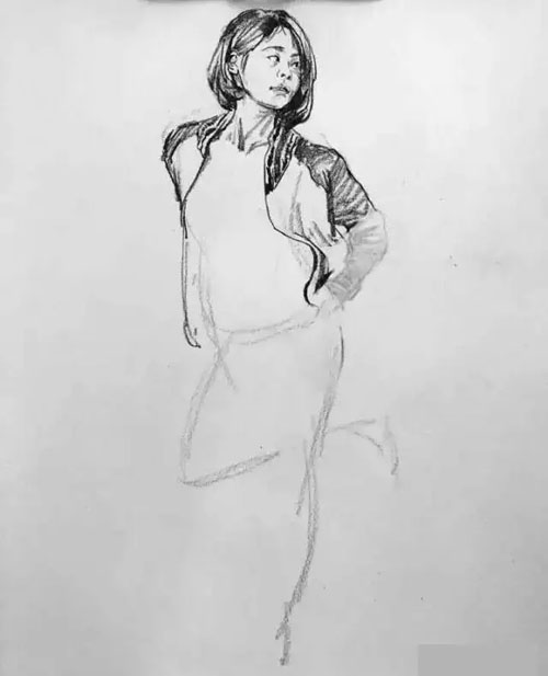 從形體結構的角度觀察,而不要局部的看對象。例如對于衣紋的表現不要看見多少畫多少,要有取舍的畫,例如模特胳膊大約有十七、八根線條,你可以通過概括組織的方式表現主要結構關系的線條,這樣就不會面對復雜的衣紋無從下手了。