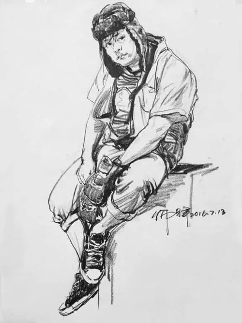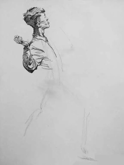 堅持整體-局部-整體的原則,對人物局部進行具體刻畫,再從整體做調整,對于整體效果沒有作用的地方,要懂得舍棄,而對于表現人物形體結構非常重要的點,即使在觀察中并不明顯,也要合理發揮想象,將這部分加以展現,學會將衣服紋理和人體動作相結合,做到“避輕就重”、“化虛為實”。