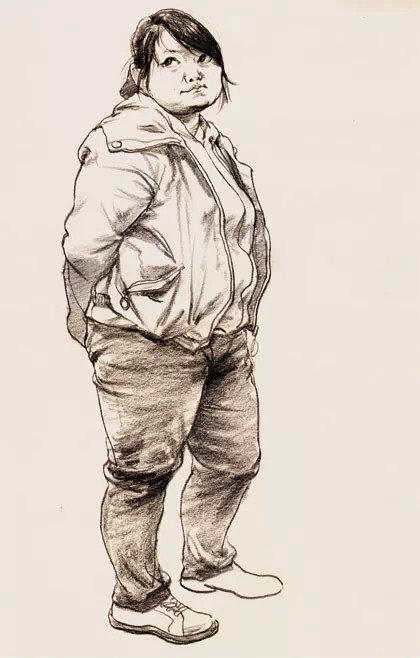 頭的仰、俯、側、轉等是動態的組成環帶,必須表現,但沒有必要仔細考察和刻畫其五官形象,否則會分散注意力,失去時間,難以畫準動態。在動態速寫中,頭部的重要性在于:人體各部位的長度比例要以頭長標準尺度進行目測。失去這個標準,就會出現其他部位比例過長或過短的失調現象。