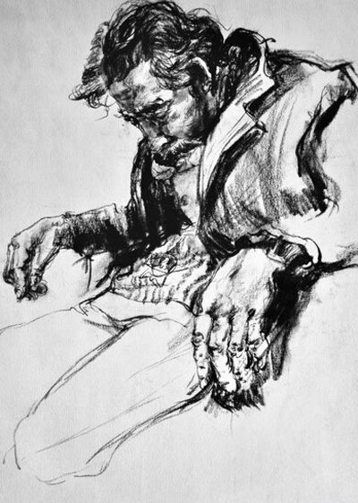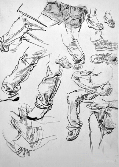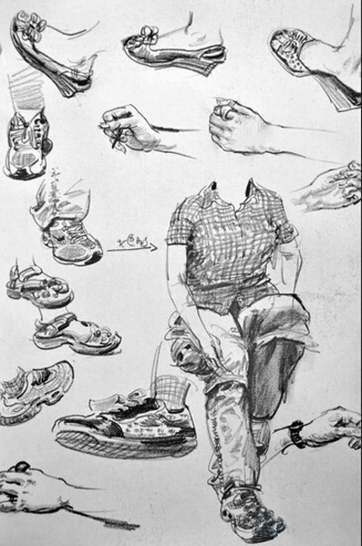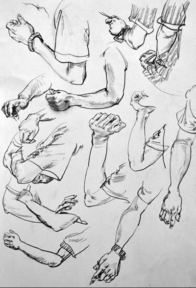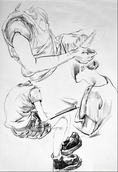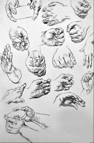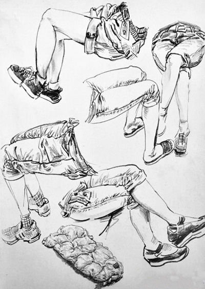 衣紋線多指關節處的衣褶,在表現衣褶時,要抓住關鍵的幾個進行強調,要找準前后的穿插關系,避免不分前后上下的線條堆積。衣褶也是表現畫面疏密效果的關鍵所在。衣紋線條一般較短,表現要靈活。