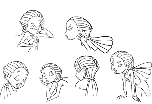 在動畫中會運用各種視角的鏡頭表現主題以豐富視覺變化的效果,如動畫片《獅子王》中小獅子辛巴出生后被舉起時那段跟移鏡頭就包含了辛巴造型的各個體面、角度。因而,在造型練習中,不單要表現一個視角的體面關系,正、側、背、俯、仰各個視角的形態變化都應注意觀察,熟練掌握其塑造的能力,以便在實際的造型設計中能結合原動畫的設計提供足夠的表現角度的參考與選擇。練習可以全身和頭部造型為主,以人物和常見動物為對象,著重觀察和以描繪、體悟其最具美感和代表性的體面和角度,通過某個角度可以表現特別的情感、或給人以視覺上的新鮮感。與一般繪畫的不同之處是動畫的每一角色的任何角度都有其意義,都有可能應用于某些鏡頭之中,這也符合人們習慣調換視角去觀察物體的心理。